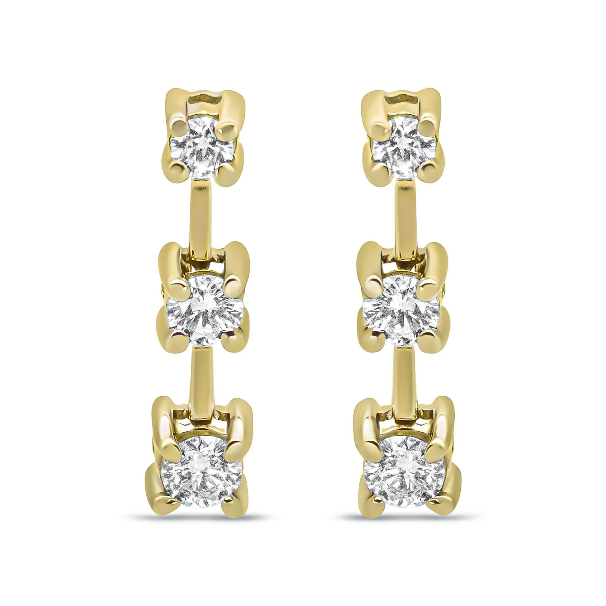 This fabulous three stone diamond earrings are set in a graduating design that align with the smallest stone at the top and the largest at the bottom in the ascending order of size. The three stone drop is a symbolism of one's past, present and future. This can relate to your own personal journey or tie in with a couple to represent their past commitment, present bond and future promises. The diamonds in this piece show off from prong settings, accompanied by genuine 14k yellow gold, a metal that will stay tarnish free for years to come. The diamonds total 1/2 cttw and are of an approximate J-K Color and SI1-SI2 Clarity. These pierced earrings secure in the ears via screw on findings and they feature an approximate dangle drop of .6 inches off of the ear. Earrings under 3/4 cttw have pushback findings for a secure fit and earrings over 3/4 cttw come with screw backs.